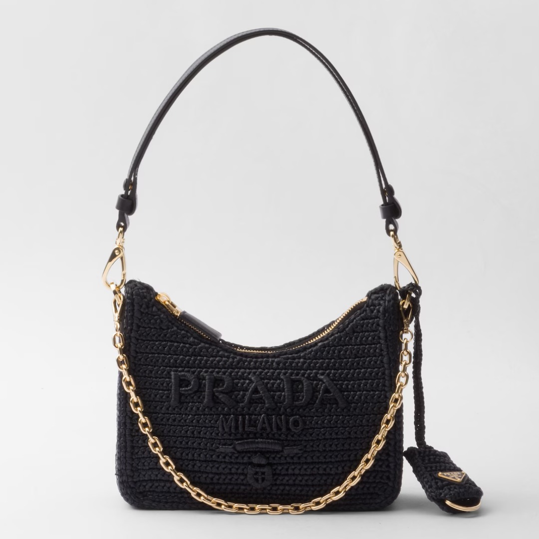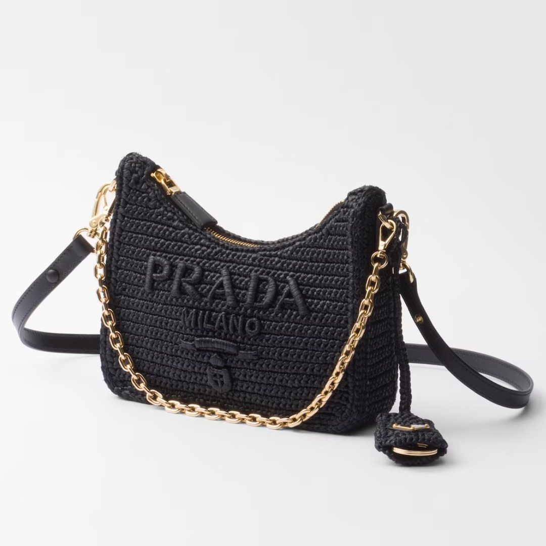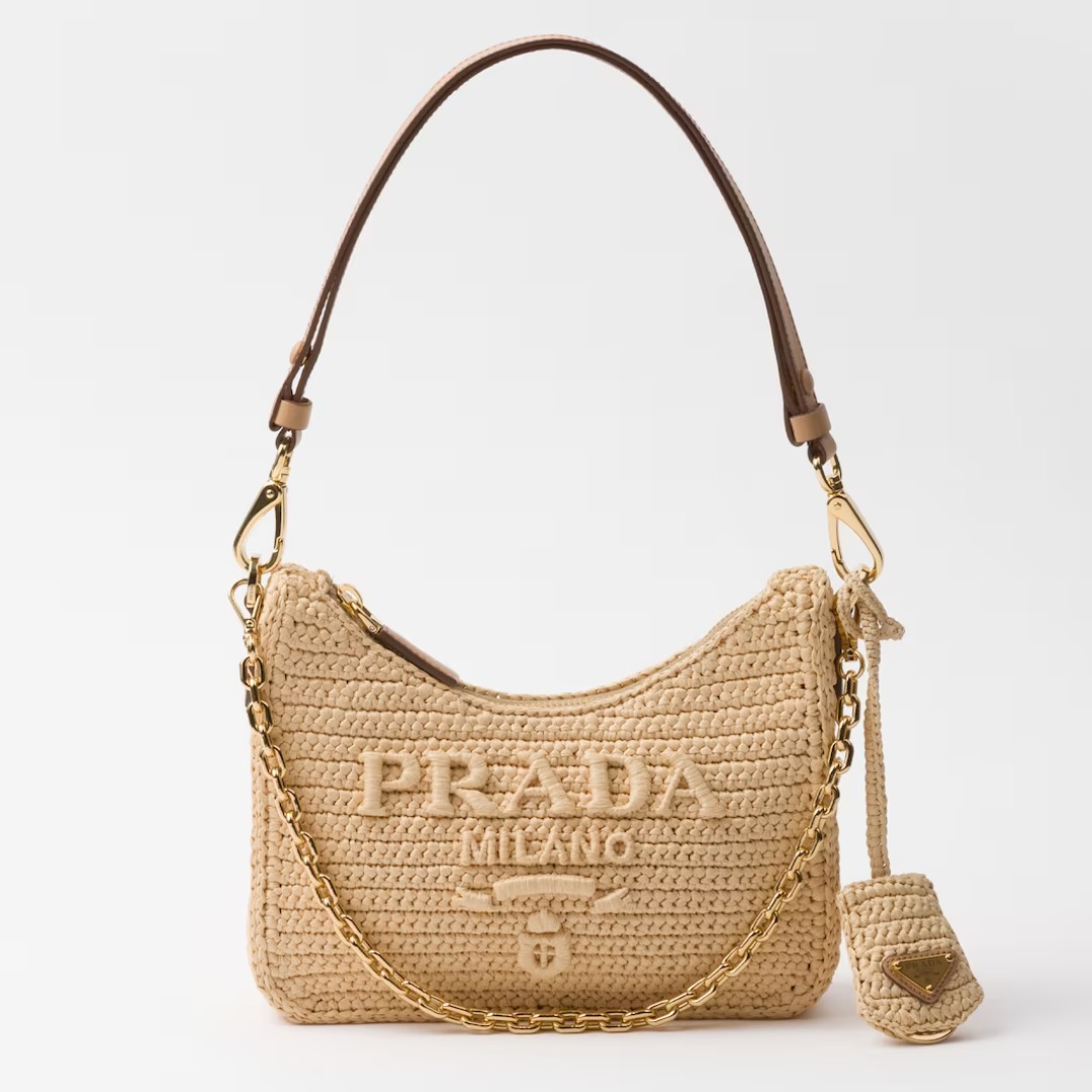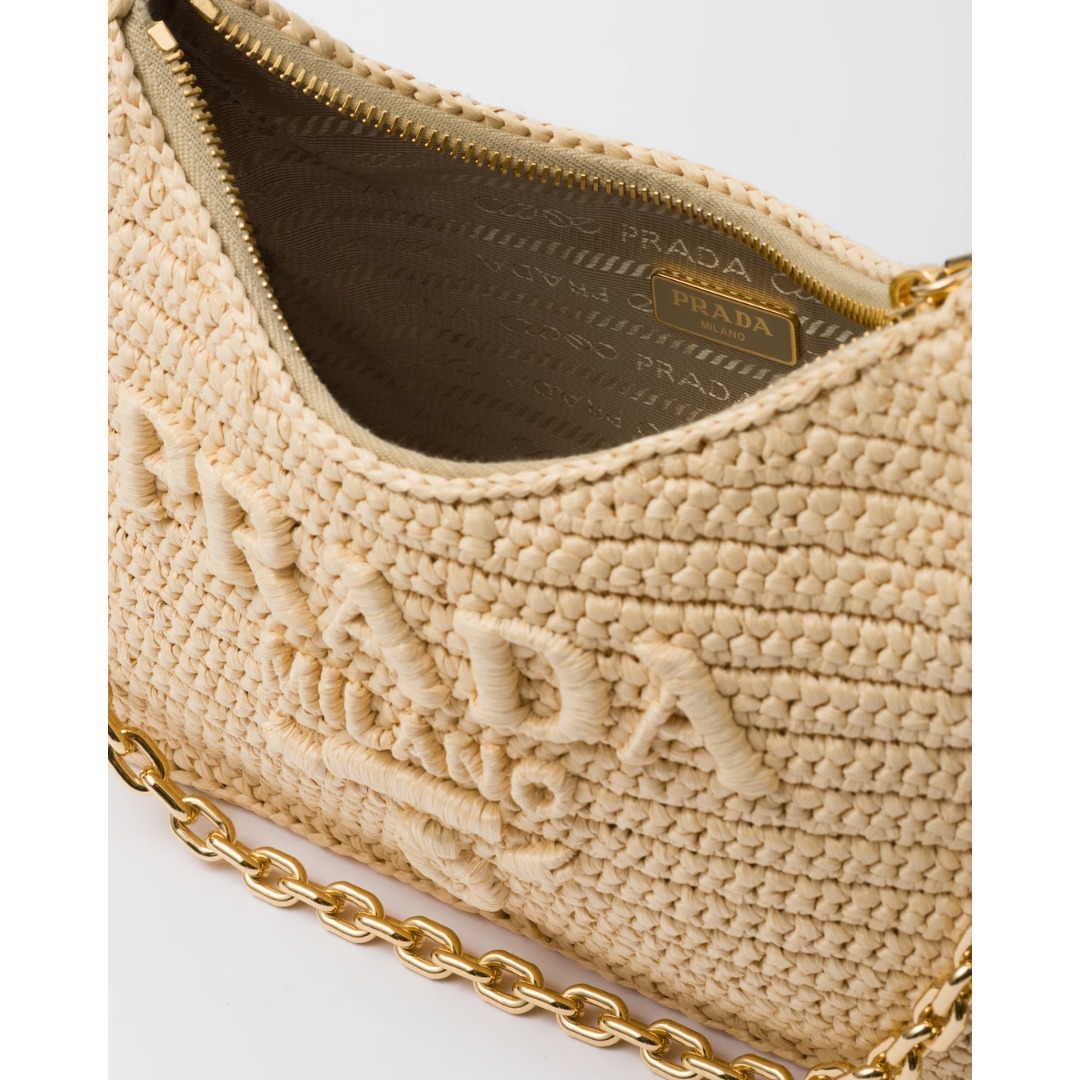 ・ラフィア風糸・かぎ針編みの仕上がり・調節可能で取り外し可能なチェーンとレザーハンドル・取り外し可能なキーホルダー・金属製ハードウェア・フロントにロゴ刺繍、バックにエナメルメタル トライアングルロゴ・ロゴプリントのナイロン裏地