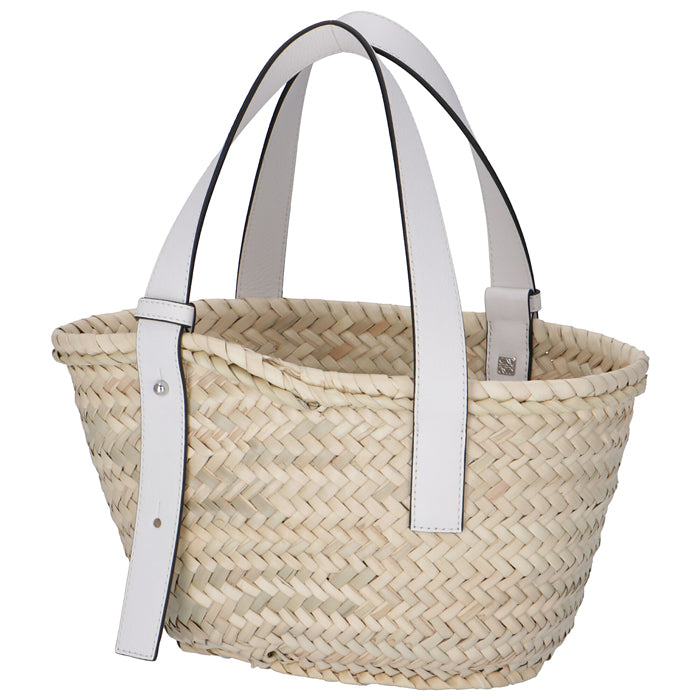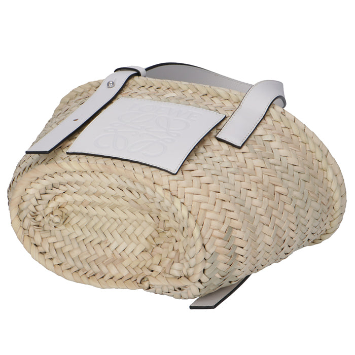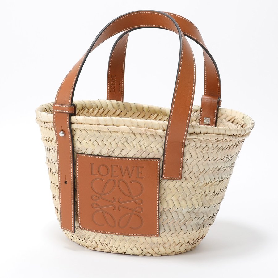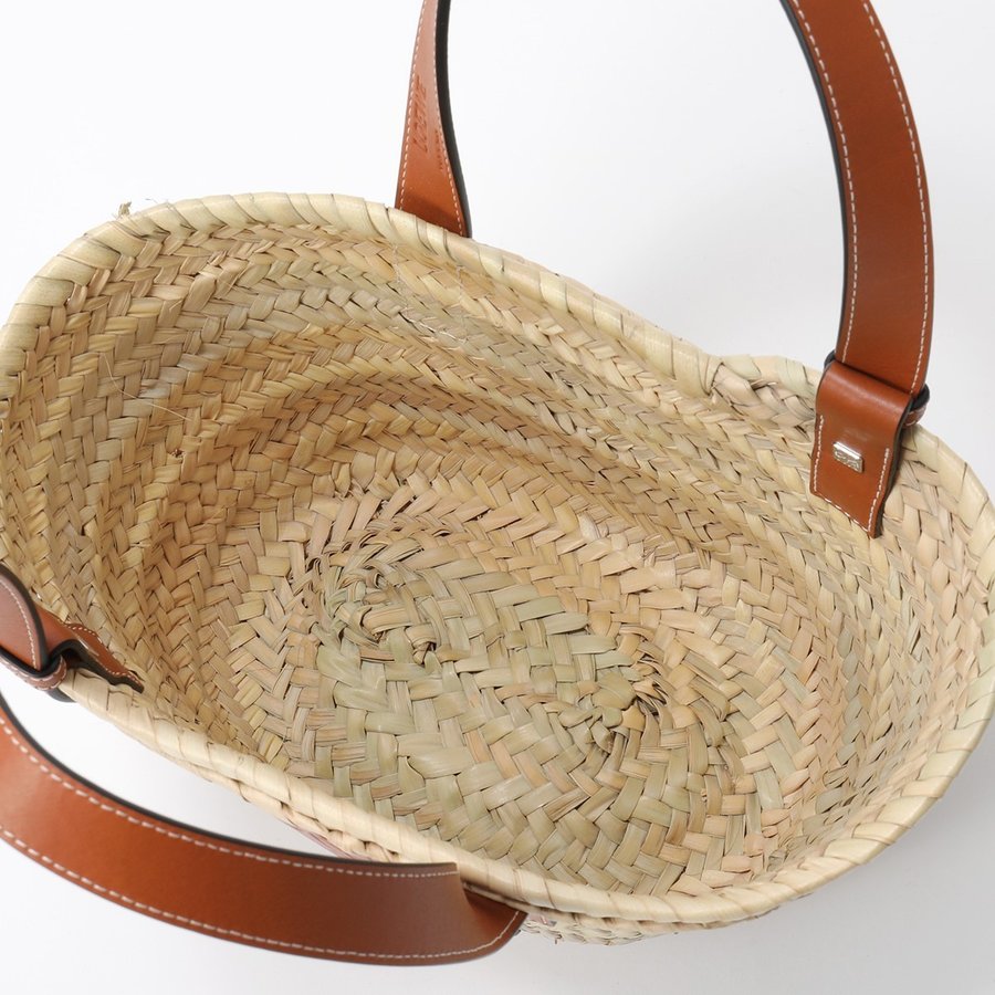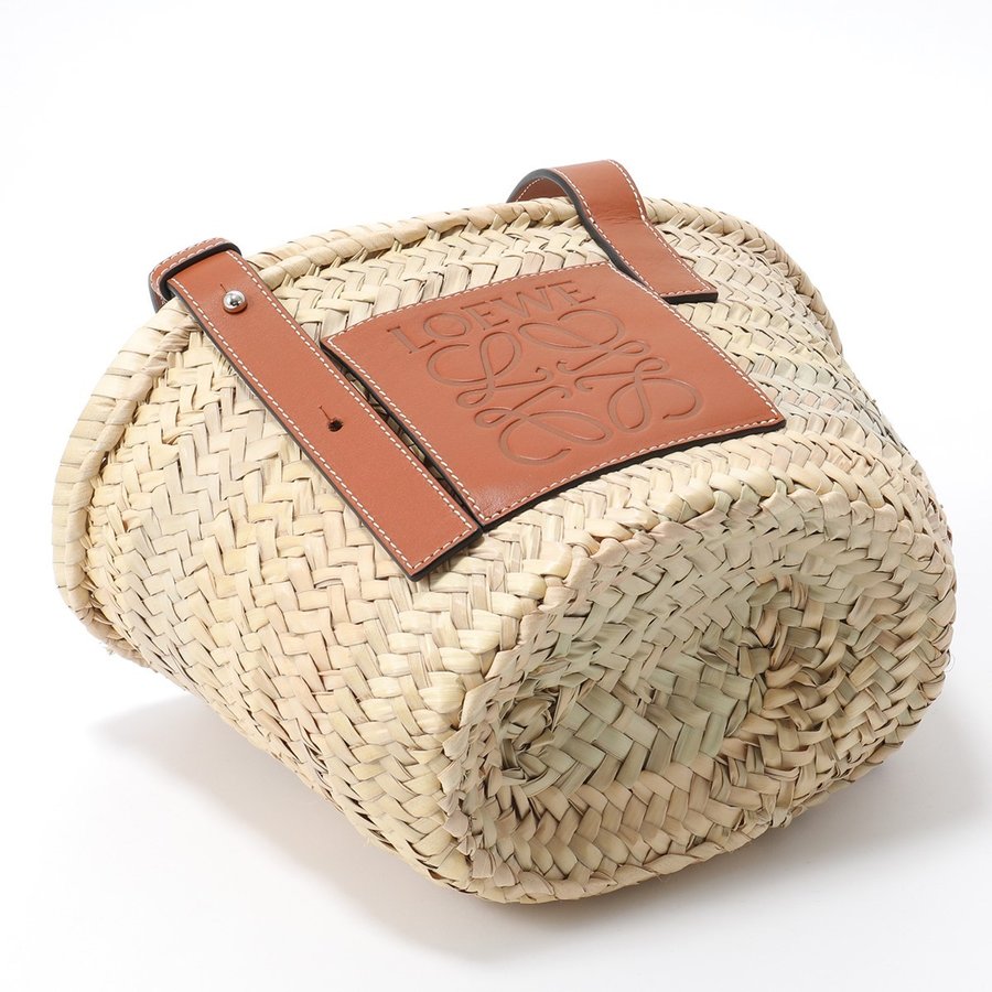 商品説明: アイコンロゴがエンボスデザインされたレザーパッチが印象的なラフィア素材のバスケットトートバッグ。シンプルでモダンなアナグラムが上品な雰囲気を漂わせます。