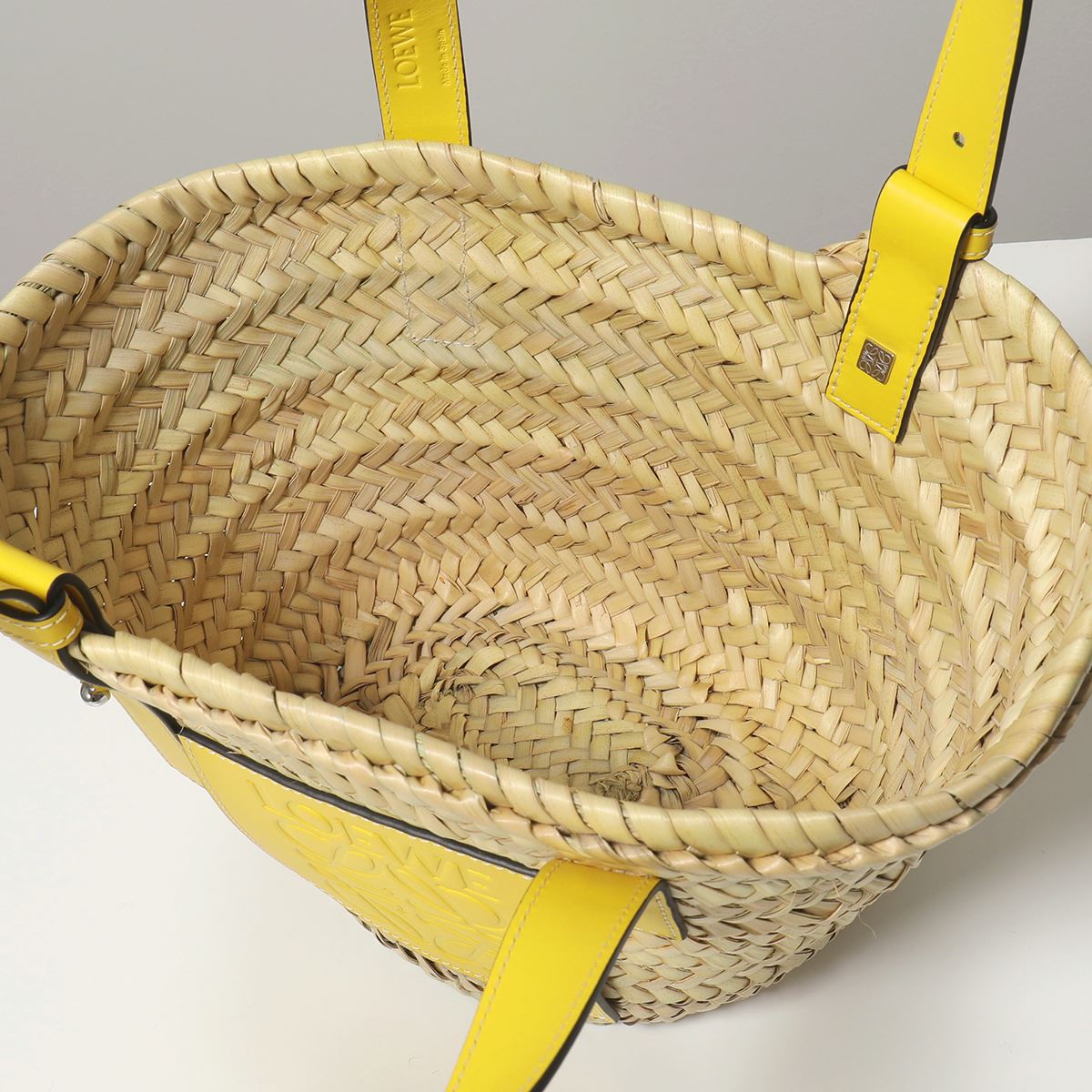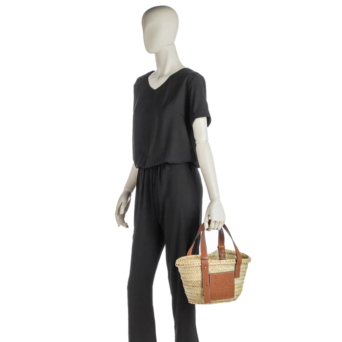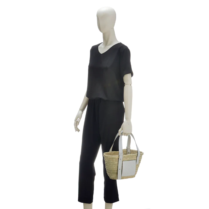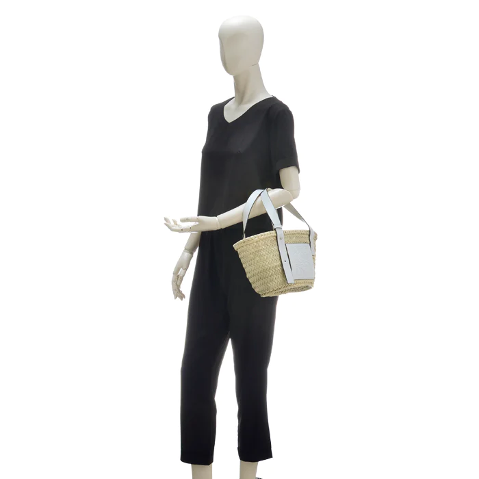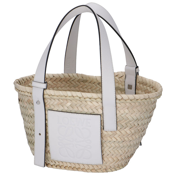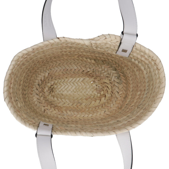 商品説明: アイコンロゴがエンボスデザインされたレザーパッチが印象的なラフィア素材のバスケットトートバッグ。シンプルでモダンなアナグラムが上品な雰囲気を漂わせます。