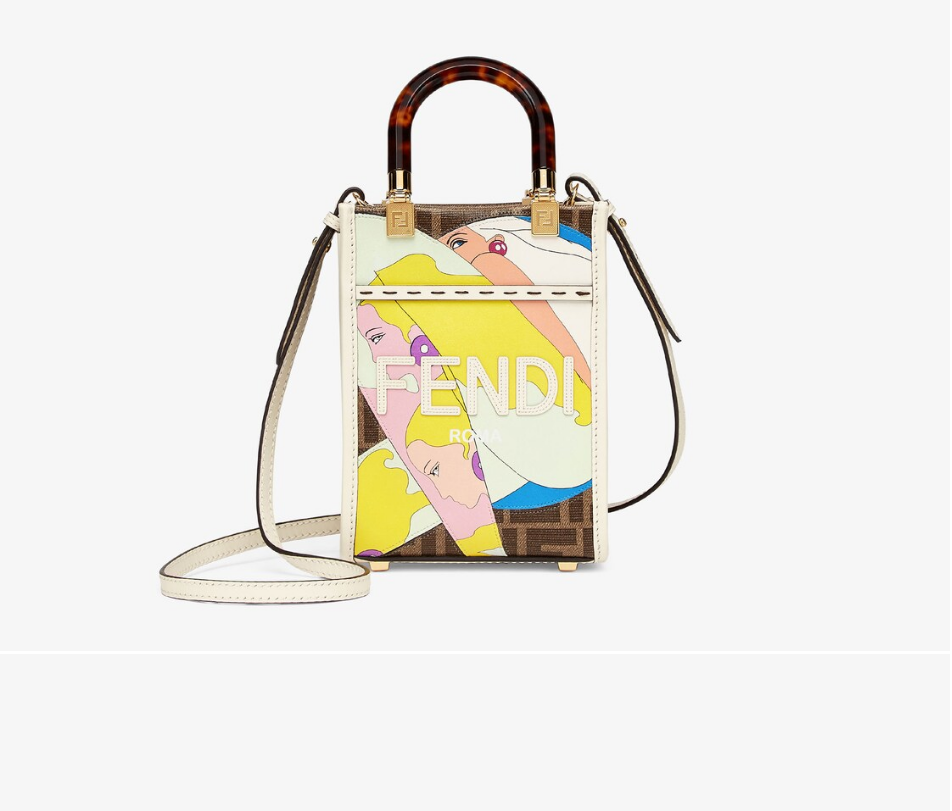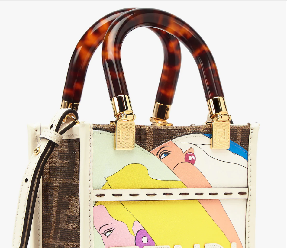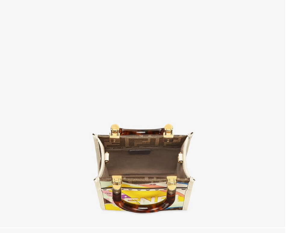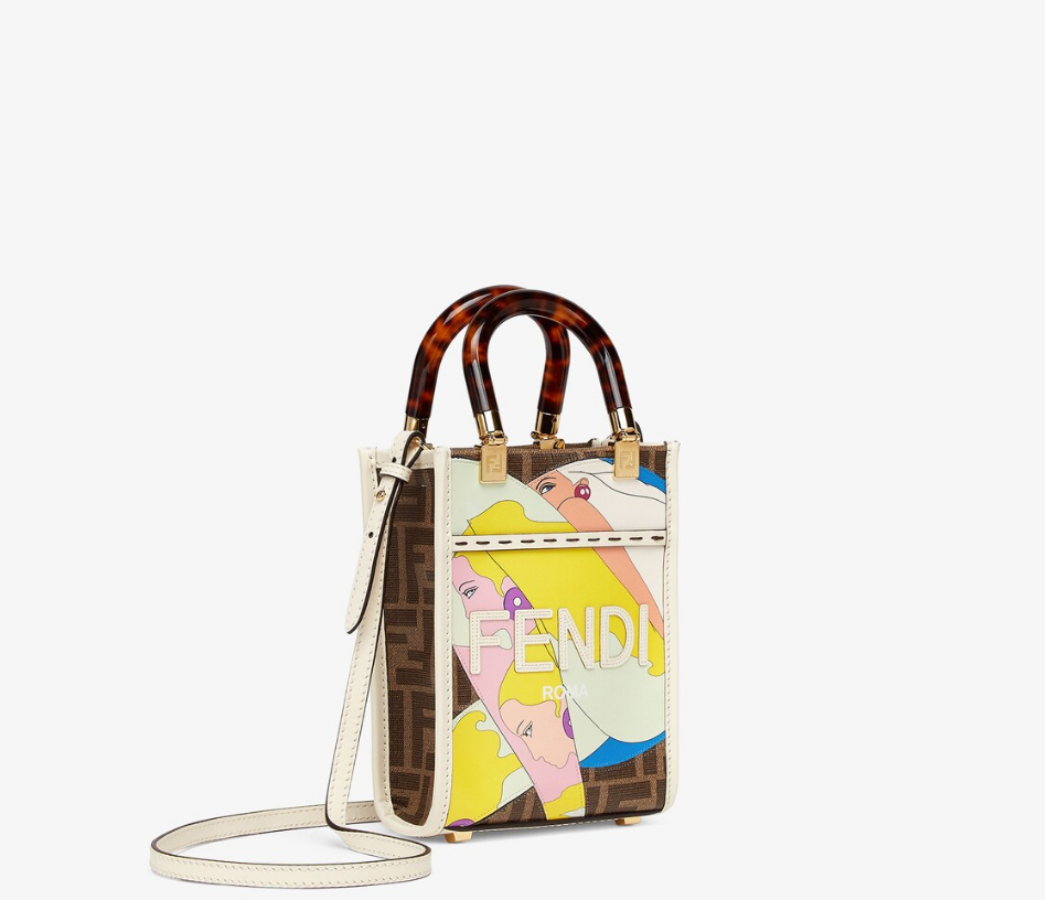 ミニデザインのSunshine生地手提げ袋には、FFモチーフの図案、パステルレザーの手作業モザイク、エンボスFENDIの文字が飾られている。硬質のべっこう効果プラスチックガラスハンドル。